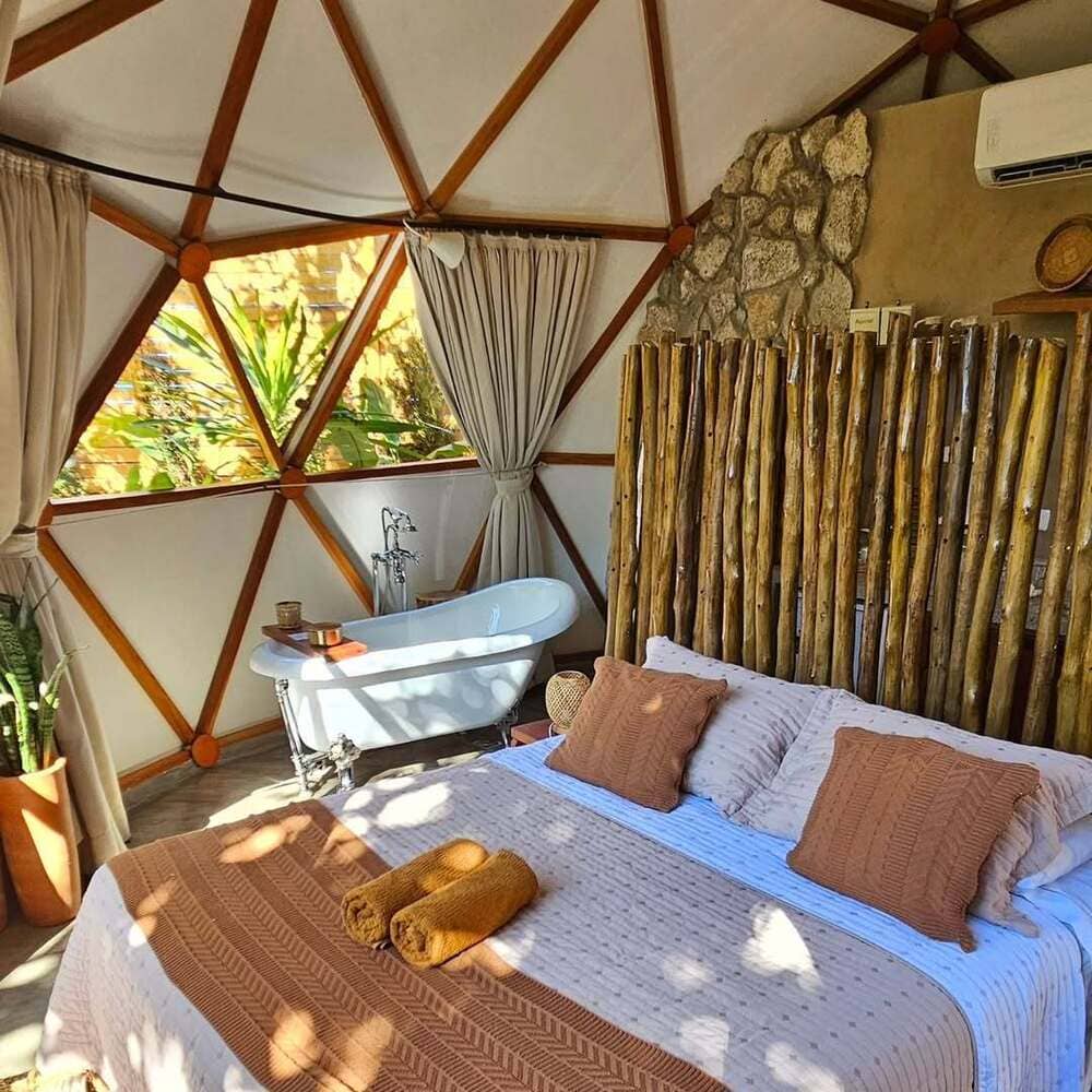 3. Iluminação Natural: A cúpula translúcida permite a entrada abundante de luz com efeito natural durante o dia e oferece uma visão incrível das estrelas à noite. Isso cria nesse sentido uma atmosfera mágica que os hóspedes adoram.